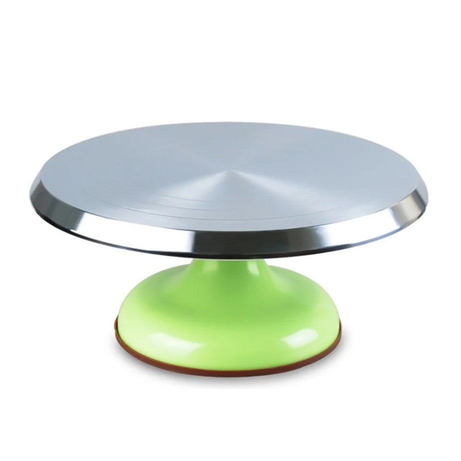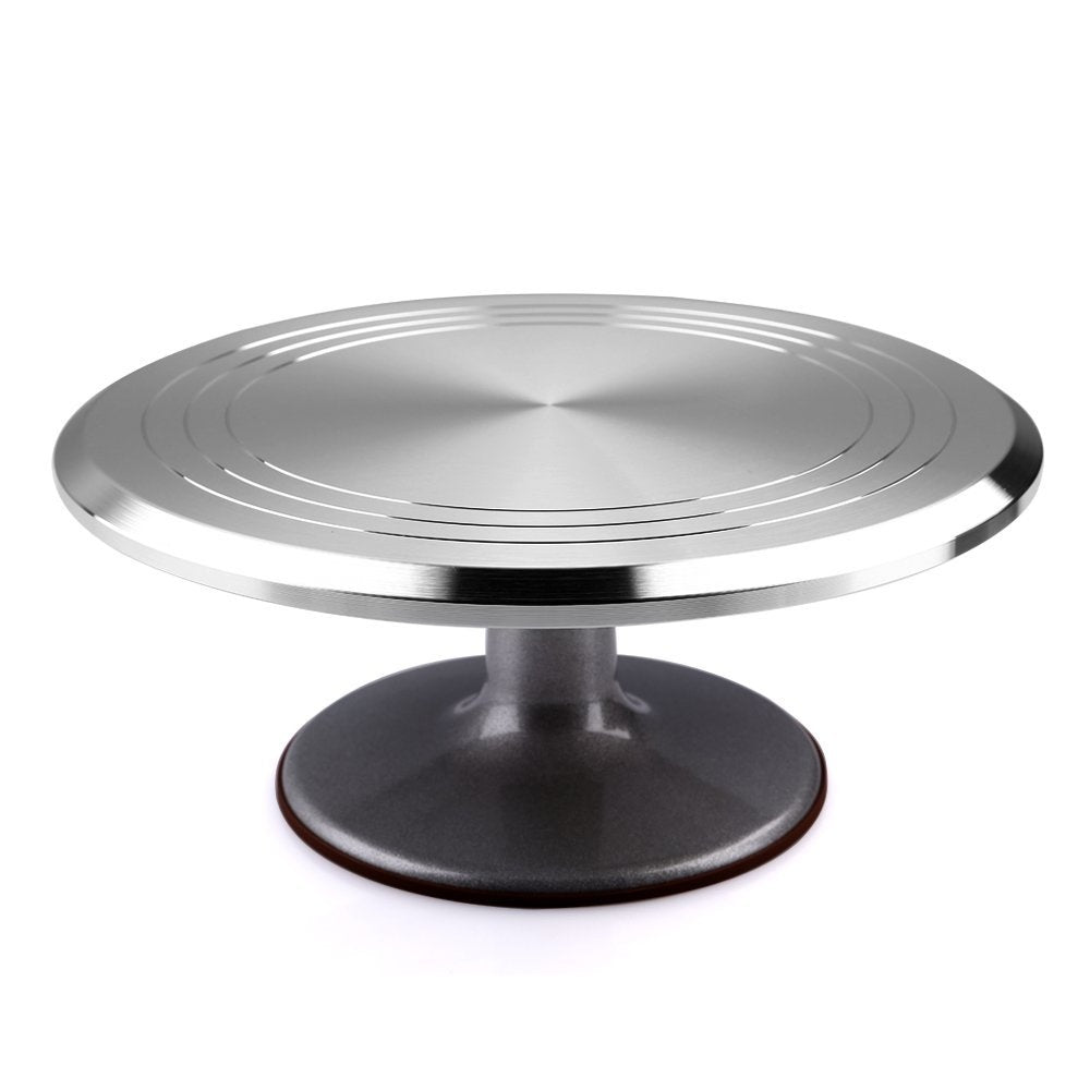 Mesa bailarina giratoria ideal para decorar y exhibir pasteles, con base antideslizante. Cuenta con rodamientos de bolas en acero inoxidable que proporcionan una rotación suave y precisa, una tapa con base de silicona antideslizante asegura la plataforma giratoria a la superficie de trabajo al decorar. Hecho de aluminio duradero.
