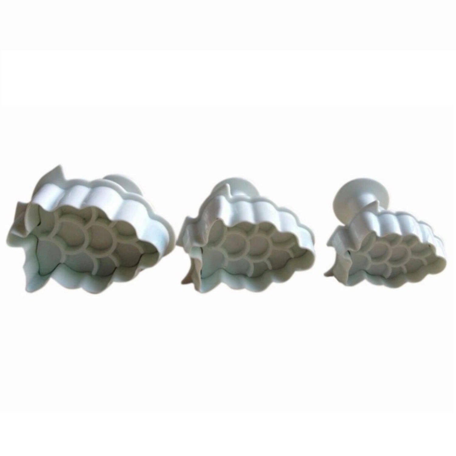 Set de mini cortadores en forma de uvas push print por 3 unidades con expulsor. Decora en diferentes tipos de masas y texturas como fondant, pasta de goma, pastillaje, mazapán. Fabricado en material plástico.