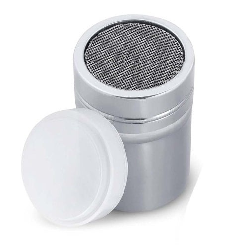 Azucarera en acero inoxidable con tapa a presión y malla en la parte superior.