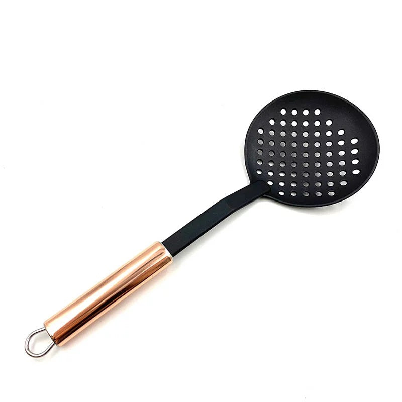 Ideal para ciudar tus ollas y sartenes con antiadherente. Nylon fuerte y flexible, no absorbe colores, ni sabores. Acabado cobre en el mango. Incluye aro colgador.