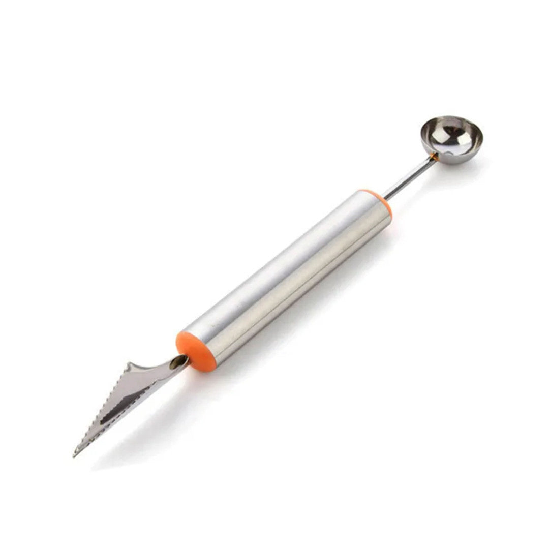 Herramienta decoración y tallado para frutas con doble uso un lado es un cuchillo de trinchar en forma de V con dientes de sierra para un corte fácil y rápido. El otro lado es una cuchara para bola para esferificaciones. Fabricado en acero inoxidable seleccionado de grado alimenticio fuerte y duradero, y no se deforma ni se dobla al excavar frutas y tallar. No se oxida, y se puede lavar juntos en el lavavajillas.