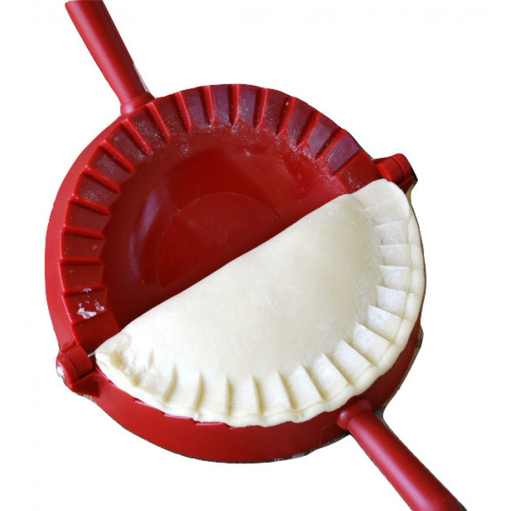 Molde para preparar empanadas, fabricado en plástico de color rojo para uso doméstico, práctico y fácil de manejar.