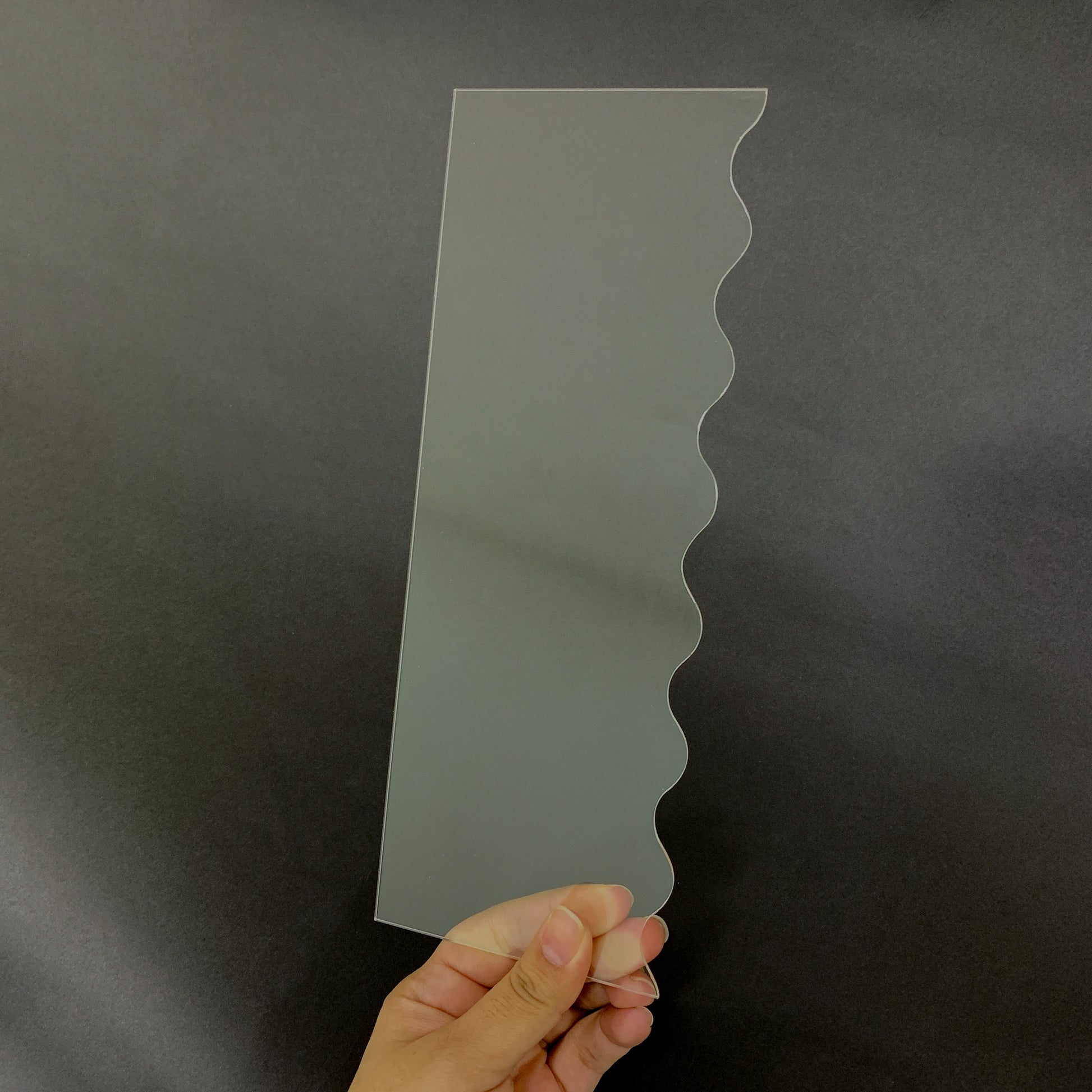 Scraper texturizador en acrílico, diseñado de forma ergonómica, y con hendiduras del tamaño ideal para evitar desperdicio de producto. Con dos diseños diferentes (una a cada lado) Permite obtener un acabado profesional en los laterales de tortas decoradas con buttercream, royal icing, nata, ganache o crema.