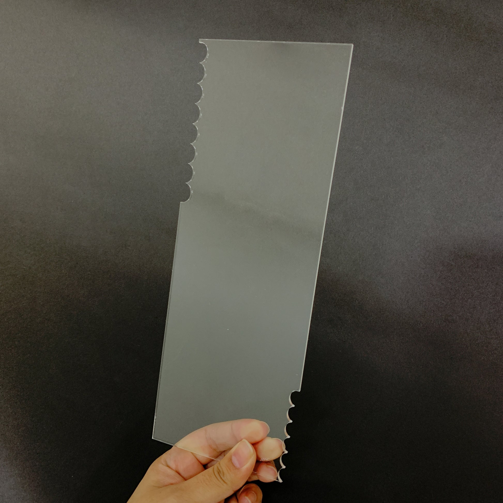 Scraper texturizador en acrílico, diseñado de forma ergonómica, y con hendiduras del tamaño ideal para evitar desperdicio de producto. Con dos diseños diferentes (una a cada lado) Permite obtener un acabado profesional en los laterales de tortas decoradas con buttercream, royal icing, nata, ganache o crema.