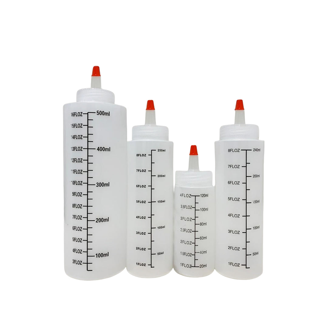 Juego de envases tipo botella por 4 unidades en distintos tamaños, no hay una forma más sencilla de fundir, dosificar y conservar el chocolate o tus salsas.