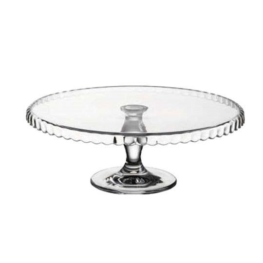 Tortera de vidrio redonda con diseño de ondas en la base.