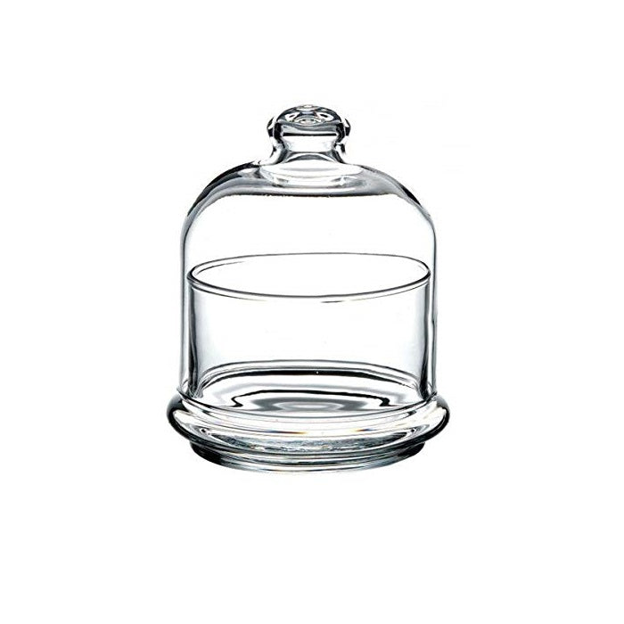 Tortera de vidrio transparente con base para conservar cupcakes.